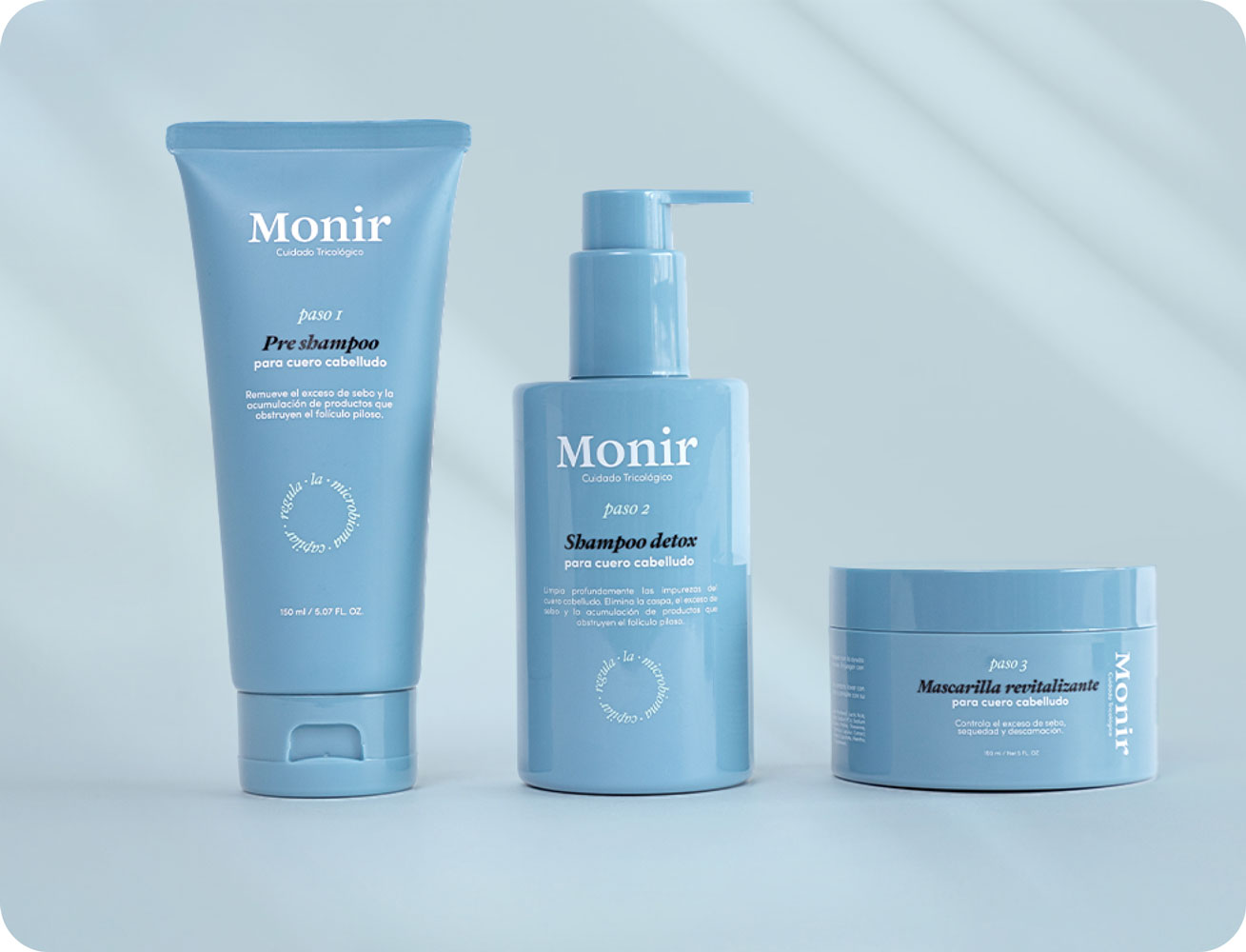 4.- Usa productos profesionales y científicamente comprobados como Monir Cuidado Tricológico, el cual mantiene el microbioma equilibrado, evitando que el cuero cabelludo se vuelva menos propenso a padecer problemas como la caspa, el exceso de grasa o la caída del cabello por la acumulación de productos en el folículo piloso.